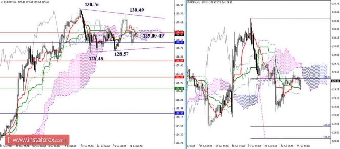 Основное значение продолжает иметь зона притяжения 129,00-49 (уровни старших таймов + облако Н4 + кресты младших таймов). Нахождение в зоне формирует неопределённость. Закрепление выше увеличивает шансы игроков на повышение, закрепление ниже возвращает возможности соперникам. В результате ближайшими ориентирами служат экстремумы. Для быков обновление максимумов 130,49 и 130,76, для медведей преодоление минимумов 128,57 и 128,48.