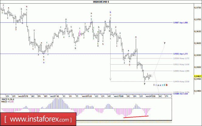 Весь минувший день пара USD/CHF провела в пределах достаточно узкого ценового диапазона, торгуясь вблизи отметки 0,9450. Сложившаяся при этом волновая ситуация позволяет предполагать, что несмотря на сохранившуюся дивергенцию MACD_ака, внутренняя волновая структура 5-й волны, в с, в с, в с, в с, в Е, в В, еще может принять несколько более сложную и протяженную форму. Если это так, то валютная пара сохранила потенциал для возобновления снижения котировок к уровню 94-й, или даже 93-й фигуры.