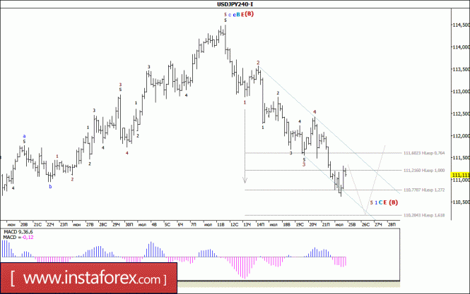 Начав вчерашние торги со снижения, уже в середине дня пара USD/JPY остановилась у отметки 110,60 и только после этого откатилась на 70 б.п., от достигнутого минимума. Таким образом, можно предположить, что валютная пара по-прежнему оставалась в стадии формирования принявшей вид незавершенной пяти-волновой структуры 5-й волны, в 1-й, в составе будущей C, в E, в (В). Если это так, то валютная пара может возобновить нисходящее движение и отработать очередную расчетную цель для всей 1-й волны, в C, в E, в (В), расположенную у отметки 110,20.