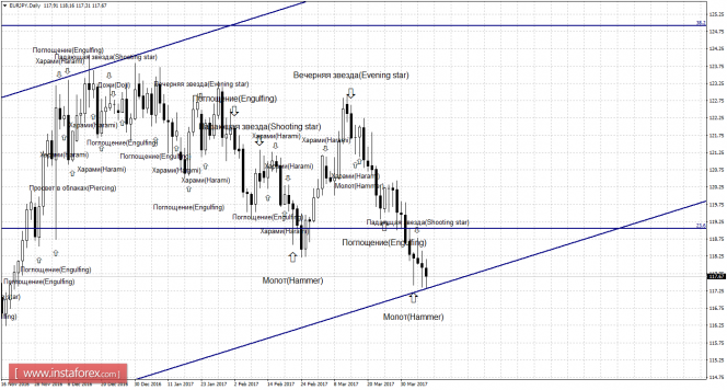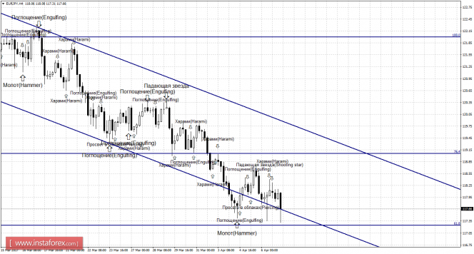Медвежьи свечные формации «Падающая звезда» и «Харами» позволили выполнить разворот в пользу японской валюты и начать новое падение в направлении уровня Фибо 61,8% - 117,24. Образование 7 апреля новой бычьей формации вновь позволит трейдерам рассчитывать на разворот в пользу валюты ЕС и некоторый рост пары в направлении коррекционного уровня 76,4% - 119,06. Такая формация будет трактоваться как коррекционная, исходя из направления равноудаленного канала. Отбой курса пары от уровня Фибо 61,8% аналогично сработает в пользу евровалюты. Закрепление котировок под уровнем коррекции 61,8% повысит шансы на дальнейшее падение в направлении следующего уровня Фибо 50,0% - 115,78.