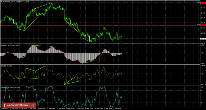 На 4-часовом графике без образования медвежьей дивергенции котировки выполнили разворот в пользу японской иены и в общем возобновили падение в направлении уровня Фибо 100,0% - 107,51. Назревающих дивергенций 7 апреля не наблюдается. Отбой курса от уровня коррекции 100,0% позволит ожидать разворот в пользу валюты США и некоторый рост в направлении коррекционного уровня 161,8% - 112,40. Закрепление котировок над уровнем Фибо 161,8% повысит вероятность продолжения роста в направлении следующего уровня коррекции 200,0% - 115,45.