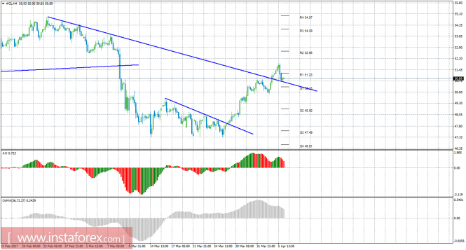 Уровни поддержки и сопротивления – красные горизонтальные линии.Материал предоставлен компанией InstaForex - www.instaforex.comТехнический анализ сырой нефти за 6 апреля 2017 года