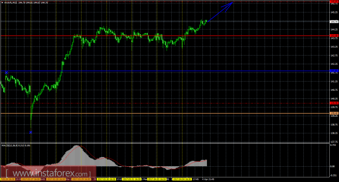Анализируя акции компании Apple 5 апреля, видим, что цена пытается возобновить восходящее движение, индикатор MACD развернулся вверх. Текущий «золотой крест» остается сильным (так как цена располагается выше облака), поэтому длинные позиции индикатор Ишимоку разрешает рассматривать. Оба канала линейной регрессии направлены вверх, поэтому лонги актуальны и по этому признаку. Целью для восходящего движения инструмента является уровень сопротивления 145,85. Следующей целью для движения вверх выступает 148,09. Новых свечных моделей на данный момент нет. MACD развернулся вверх, сигнализируя о восходящем движении, если индикатор развернется вниз, это укажет на возможное начало нисходящей коррекции. Стохастик находится в области перекупленности, что сейчас свидетельствует о восходящем настроении участников рынка. Отскок цены от первого таргета может спровоцировать коррекционное движение. Младший таймфрейм детализирует картину старшего таймфрейма. На младшем графике видно, что цена продолжает располагаться выше линии Тенкан-сен. Длинные позиции, таким образом, сейчас остаются актуальными с целью уровень сопротивления 145,85. Боковая коррекция, продолжавшаяся несколько дней, завершена.