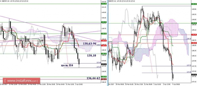 Быкам не удалось сохранить своё преимущество и расположение в бычьих зонах относительно облаков младших таймов. Поддержки и облака были пробиты, в результате чего сформированы понижательные цели, которые к настоящему моменту уже отработаны. Уровень 137,19 (100% цели Н4) сейчас может выступить в роли поддержки, способствуя торможению и развитию очередной коррекции. Среди сопротивлений сегодня можно отметить 138,10, но наибольшее значение по-прежнему имеет зона облаков младших таймфреймов, усиленная дневным крестом (138,63-96). Ориентиром для продолжения снижения является 136,44-62.