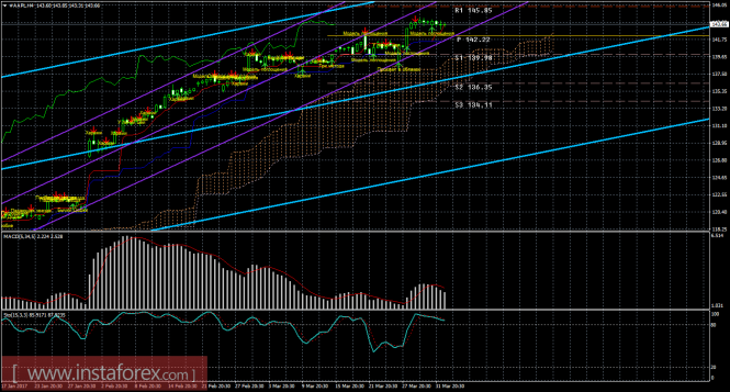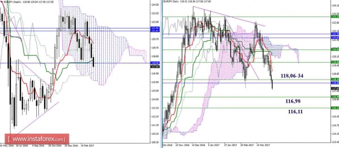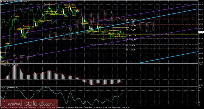 Индикатор MACD – красная линия и гистограмма с белыми барами в окне индикаторов.Материал предоставлен компанией InstaForex - www.instaforex.comДневной обзор GBP/JPY и EUR/JPY на 04.04.17. Индикатор Ишимоку