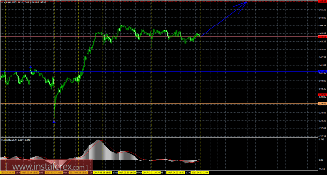 На 15-минутном графике рекомендуется рассматривать лонги с целью 145,85 при закреплении цены выше Тенкан-сен (142,49), ордере Stop Loss ниже 142,49. Но лучше сначала дождаться завершения флэта.