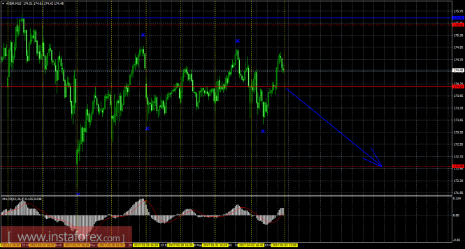 На младшем графике рекомендуется рассматривать ордера на продажу с целью 172,49 при открытии ниже Тенкан-сен (173,97), ордере Stop Loss выше 173,97 и при направленном вниз индикаторе MACD. Однако лучше дождаться завершения флэта до открытия любых позиций.