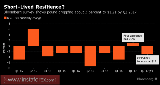 2017-04-03 16:03:41 (читать в оригинале)Британский фунт сумел закрыть квартал в плюсе по отношению к американскому доллару впервые с середины 2015 года, однако его ближайшие перспективы вызывают большие сомнения у экспертов Bloomberg. Их средняя оценка предполагает, что к концу июня пара GBP/USD опустится к отметке 1,21 на фоне проблем в переговорах между Лондоном и Брюсселем по поводу Brexit и разных векторов денежно-кредитной политики Банка Англии и ФРС. BoE готов терпеть инфляцию в 3%, в то время как представители FOMC не исключают возможность четырех повышений ставки по федеральным фондам в 2017 году.