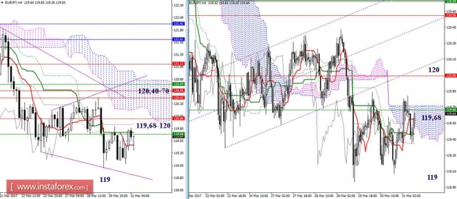 Закрепление выше 119,68-120 вернёт пару под зону сопротивлений, сформированную сразу несколькими уровнями старших временных интервалов (120,40-70). Объединение данных уровней сейчас усиливает сопротивление облака Н4, пробой облака открывает перед игроками на повышение новые перспективы