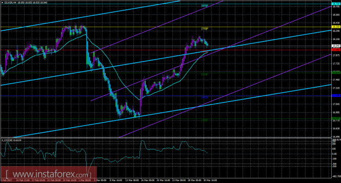 Индикатор MACD – красная линия и гистограмма с белыми барами в окне индикаторов.Материал предоставлен компанией InstaForex - www.instaforex.comТехническая картина инструмента SILVER по системе «Каналы регрессии» за 31 марта 2017 года