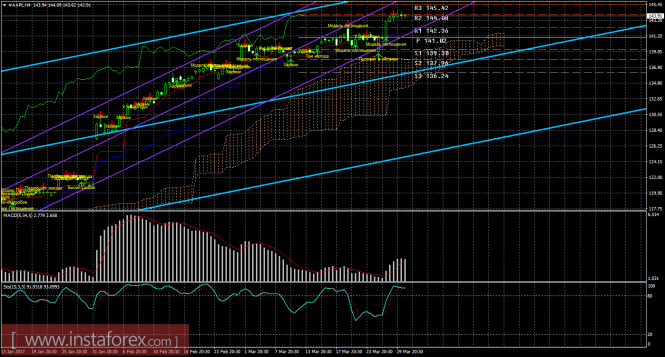 На 15-минутном графике рекомендуется рассматривать лонги с целью 145,42 при закреплении цены выше 144,08, ордером Stop Loss ниже 144,08 и при направленном вверх индикаторе MACD.