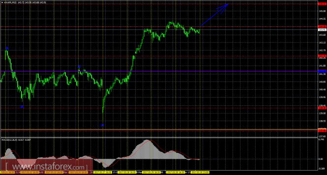 Цена акций Apple продолжает движение вверх. На текущем графике сейчас рекомендуется рассматривать длинные позиции с целями 144,08 и 145,42. Закрывать вручную ордера на покупку можно будет в случае разворота индикатора MACD вниз или при формировании медвежьей модели (с подтверждением). Стоп лосс при торговле на повышение выставляем ниже критической линии 141,45. Ордера на продажу сейчас не актуальны.