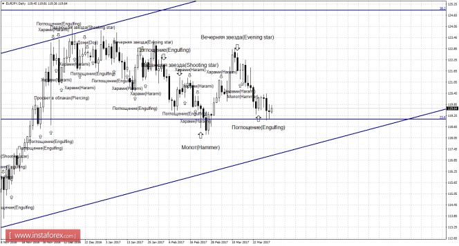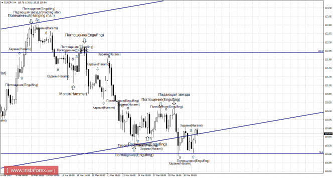 Медвежья формация «Харами», образовавшаяся на 4-часовом графике, позволяла ожидать некоторое падение, но после образования бычьей формации «Поглощение», пара выполнила разворот в пользу европейской валюты и начала рост в направлении коррекционного уровня 100,0% - 122,00. Образование 31 марта медвежьей формации позволит рассчитывать на разворот пары в пользу японской валюты и возврат котировок к уровню коррекции 76,4% - 119,07. Закрепление курса пары под уровнем Фибо 76,4% повысит вероятность дальнейшего падения в направлении уровня коррекции 61,8% - 117,24.