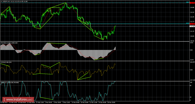 После образования бычьей дивергенции на 4-часовом графике, пара продолжает процесс роста в направлении уровня коррекции 161,8% - 112,40. Бычья дивергенция у индикатора MACD: последний лоу индикатора получился выше предыдущего, а аналогичный лоу котировок - ниже предыдущего. Назревающих дивергенций 31 марта не видно. Отбой котировок от уровня Фибо 161,8% позволит трейдерам рассчитывать на разворот в пользу валюты Японии и некоторое падение в направлении коррекционного уровня 100,0% - 107,51. Закрепление пары над уровнем Фибо 161,8% повысит шансы на дальнейший рост в направлении следующего уровня коррекции 200,0% - 115,45.