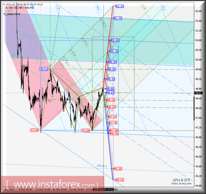 Дальнейшее развитие движения цены инструмента (#СL) в период 30 марта - 05 апреля 2017 г. будет обусловлено отработкой верхней границы (уровень сопротивления 48.80) канала 1/2 Median Line Minuette и верхней границы (уровень поддержки 48.65) канала 1/2 Median Line Micro.