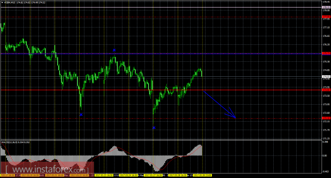 На младшем графике рекомендуется рассматривать ордера на продажу с целью 172,32 при открытии ниже Тенкан-сен (173,81), ордере Stop Loss выше 173,81 и при направленном вниз индикаторе MACD.