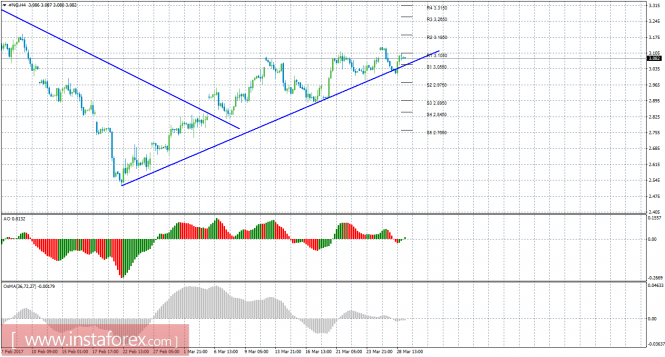 Красная линия и гистограмма с белыми барами в окне индикаторов.Материал предоставлен компанией InstaForex - www.instaforex.comТехнический анализ природного газа за 29 марта 2017 года