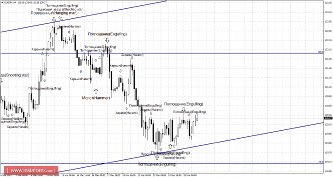 Медвежья формация «Поглощение», образовавшаяся накануне на 4-часовом графике, позволяла рассчитывать на некоторое падение, но без образования бычьей формации котировки выполнили разворот в пользу евровалюты и начали процесс роста в направлении уровня Фибо 100,0% - 122,00. Образование 29 марта новой медвежьей формации будет являться коррекционным сигналом, исходя из направления равноудаленного канала, и вновь позволит трейдерам ожидать разворот в пользу валюты Японии и некоторое падение в направлении коррекционного уровня 76,4% - 119,06. Закрепление курса под уровнем Фибо 76,4% сработает в пользу дальнейшего падения в направлении уровня коррекции 61,8% - 117,23.