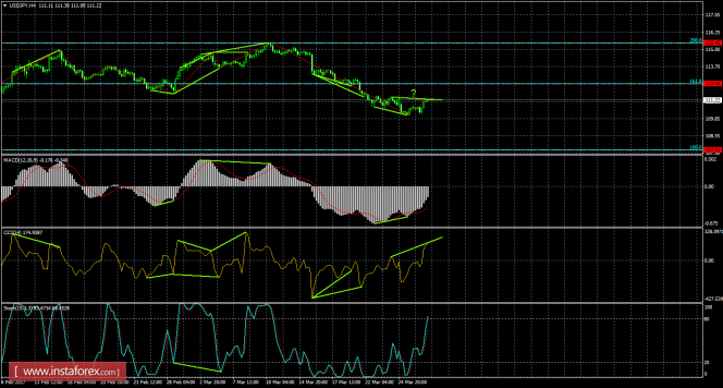 После образования новой бычьей дивергенции на 4-часовом графике, пара выполнила разворот в пользу валюты США и начала рост в направлении уровня Фибо 161,8% - 112,40. Бычья дивергенция у индикатора MACD: последний лоу индикатора получился выше предыдущего, а аналогичный лоу котировок - ниже предыдущего. 29 марта назревает медвежья дивергенция у индикатора CCI: последний пик котировок может получиться ниже предыдущего, а аналогичный пик индикатора - уже выше предыдущего. Медвежья дивергенция может позволит паре выполнить разворот в пользу валюты Японии и возобновить падение в направлении уровня коррекции 100,0% - 107,51.