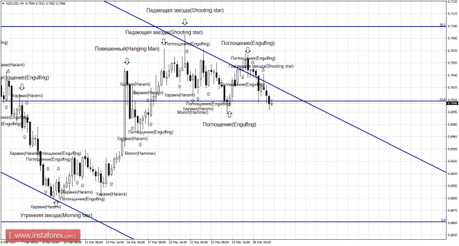 На 4-часовом графике образовалась медвежья формация «Падающая звезда», которая сработала в пользу продолжения падения котировок. В итоге пара выполнила закрепление под уровнем Фибо 23,6% - 0,7008. Таким образом, падение котировок может быть продолжено в направлении следующего уровня коррекции 0,0% - 0,6861. Образование 29 марта бычьей формации позволит трейдерам ожидать разворот в пользу новозеландской валюты и некоторый рост. Закрепление котировок над уровнем Фибо 23,6% аналогично сработает в пользу роста в направлении коррекционного уровня 38,2% - 0,7099.