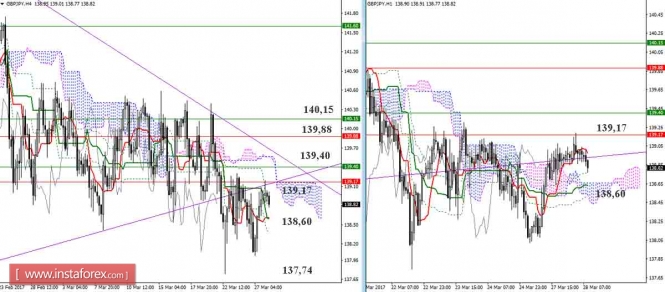 Ситуация почти не изменилась, соперники продолжают борьбу под встреченным сопротивлением (139,17). В результате длительного противостояния, пусть и в небольшом диапазоне, индикатор Ишимоку на младших таймах всё больше перестраивается на поддержку игроков на повышение. Преодоление зоны (139,17-40) открывает новые возможности перед игроками на повышение и формирует повышательную цель на пробой облака Н4.