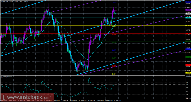 Хайкен Аши – индикатор, окрашивающий бары в голубой или фиолетовый цвета.Материал предоставлен компанией InstaForex - www.instaforex.comТехническая картина инструмента GOLD по системе «Каналы регрессии» за 28 марта 2017 года