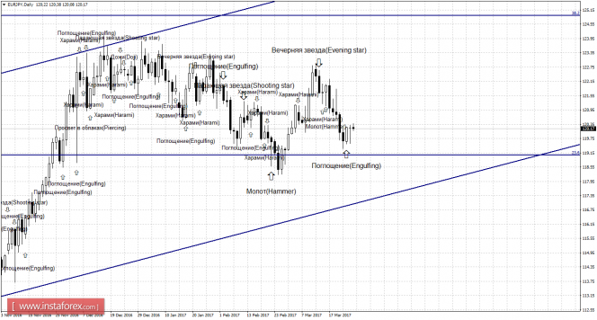 Несильная бычья формация «Харами», образовавшаяся на 4-часовом графике, позволила паре выполнить некоторый рост, но после образования сильной медвежьей формации «Поглощение» котировки выполнили разворот в пользу японской иены и начали падение в направлении уровня Фибо 76,4% - 119,06. Образование 28 марта бычьей формации позволит трейдерам рассчитывать на разворот в пользу валюты ЕС и новый рост в направлении коррекционного уровня 100,0% - 122,00. Отбой курса от уровня Фибо 76,4% аналогично сработает в пользу евровалюты. Закрепление пары под уровнем коррекции 76,4% повысит вероятность продолжения падения котировок в направлении уровня Фибо 61,8% - 117,23.