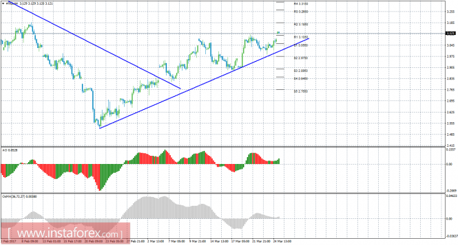 Красная линия и гистограмма с белыми барами в окне индикаторов.Материал предоставлен компанией InstaForex - www.instaforex.comТехнический анализ природного газа за 27 марта 2017 года