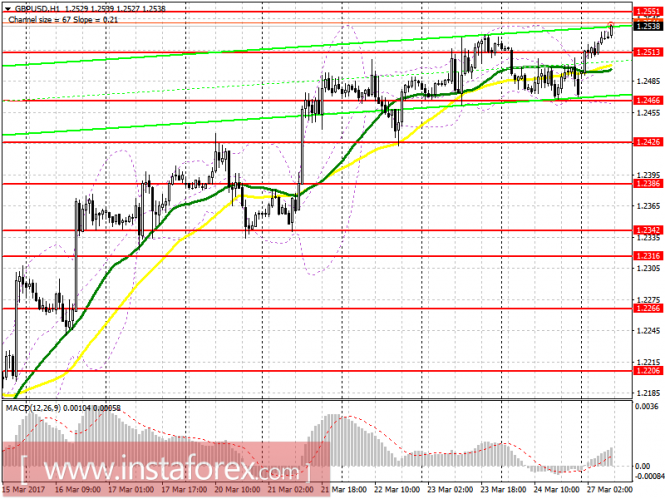 Развитие движения цены инструмента (GBP/USD) в период 27-28 марта 2017 г. будет обусловлено отработкой границ канала 1/2 Median Line (1.2490 <-> 1.2505 <-> 1.2520) вил операционного масштаба Micro.