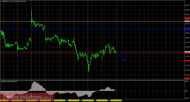 На младшем графике рекомендуется рассматривать ордера на продажу с целями 173,95 и 172,27 при открытии ниже 174,68 (Тенкан-сен), ордером Stop Loss выше 174,68 и при направленном вниз индикаторе MACD.