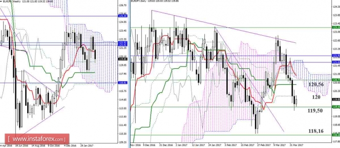 Продолжив снижение, пара спустилась к поддержке недельного Фибо Киджуна (119,50). К закрытию недели игроки на понижение пришли, реализовав медвежий потенциал недельных Проникающих линий. Бонусом для них было бы закрытие недели под поддержкой 119,50, но, судя по движению, поддержка будет использована для формирования коррекции, первоначальной целью которой является ретест пробитого дневного креста Ишимоку.