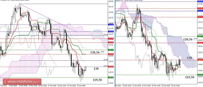 Вчера игрокам на повышение не удалось завладеть краткосрочным трендом Н4, необходимым для развития коррекции. Пара продолжила снижение к следующему ориентиру – недельной поддержке 119,50. Сегодня игроки на повышение делают новую попытку, в результате, после закрепления над Тенканом Н4 и усиливающим его дневным Фибо Киджуном (120), можно ожидать развитие полноценной восходящей коррекции, её основным ориентиром является в настоящий момент зона 120,56-77 (Киджун Н4 + Сенкоу Спан Б Н1 + уровни старших таймов).