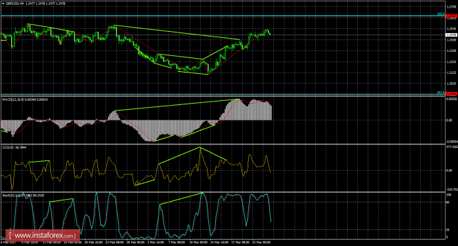 На 4-часовом графике процесс роста пары продолжается в направлении уровня коррекции 200,0% - 1,2652, а медвежья дивергенция - отменена. Новых назревающих дивергенций 24 марта не наблюдается ни у одного индикатора. Отбой курса пары от уровня Фибо 200,0% позволит трейдерам рассчитывать на разворот в пользу американской валюты и некоторое падение в направлении коррекционного уровня 261,8% - 1,1926. Закрепление котировок над уровнем Фибо 200,0% повысит вероятность дальнейшего роста в направлении следующего уровня коррекции 161,8% - 1,3106.