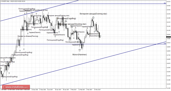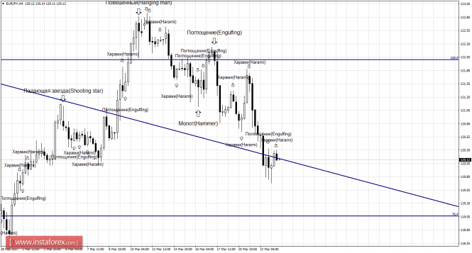 Образование на 4-часовом графике двух медвежьих формаций «Поглощение» и «Харами» позволяют рассчитывать на продолжение падения котировок в направлении уровня коррекции 76,4% - 119,06. Образование 23 марта бычьей формации позволит ожидать разворот в пользу европейской валюты и некоторый рост пары в направлении коррекционного уровня 100,0% - 122,00. Отбой котировок от уровня Фибо 76,4% аналогично сработает в пользу начала роста пары. Закрепление курса пары под уровнем коррекции 76,4% повысит шансы на продолжение падения в направлении следующего уровня Фибо 61,8% - 117,24.