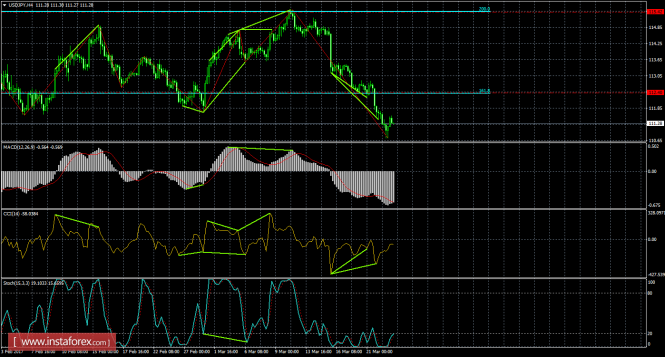 Еще одна, уже вторая подряд, бычья дивергенция на 4-часовом графике не позволила паре начать рост. Лоу дивергенции пройден, а дивергенция отменена. В итоге падение котировок продолжается 23 марта в направлении уровня коррекции 100,0% - 107,52. Новых назревающих дивергенций сегодня нет ни у одного индикатора. Закрепление котировок над уровнем Фибо 161,8% - 112,40 позволит рассчитывать на некоторый рост пары в направлении коррекционного уровня 200,0% - 115,42.