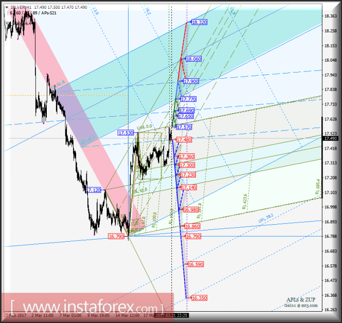 Развитие движения цены инструмента (Silver Spot) в период 22-28 марта 2017 г. будет обусловлено отработкой границ каналов 1/2 Median Line вил операционных масштабов -> Minuette (17.480 <-> 17.690 <-> 17.900) и Micro (17.570 <-> 17.690 <-> 17.770).