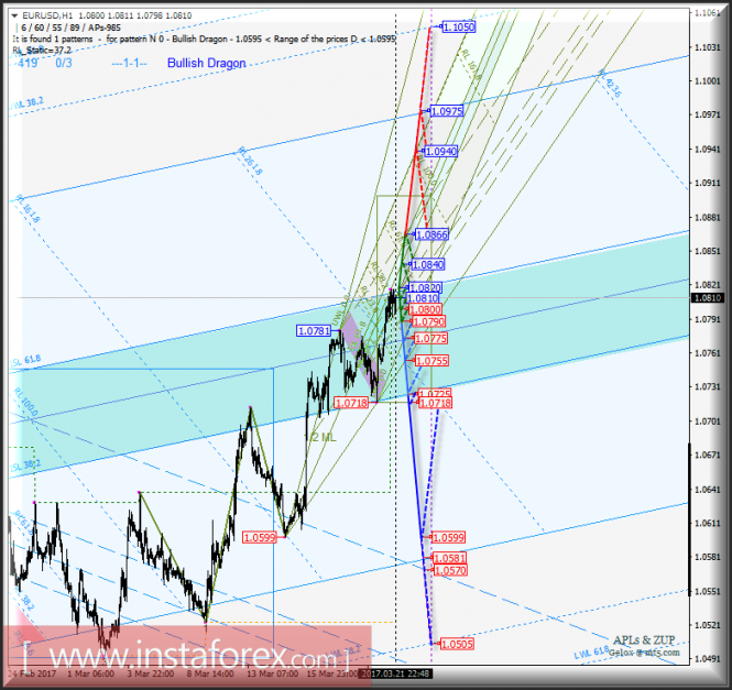 Индикатор MACD - красная линия и гистограмма с белыми барами в окне индикаторов.Материал предоставлен компанией InstaForex - www.instaforex.comEUR/USD h1. Варианты развития движения с 22 марта 2017 г. Анализ APLs & ZUP