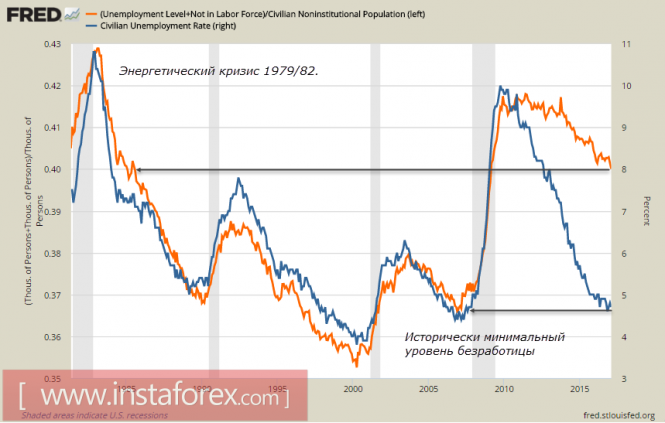 Согласно отчету по занятости за март, безработица в США на данный момент составляет 4.7%, что ниже долгосрочного среднего значения 4.8%, рассчитываемого с 1948 г. В то же время соотношение безработных и лиц, выпадающих из состава рабочей силы, и трудоспособного населения по-прежнему находится на уровнях 30-летних максимумов, и это едва лучше, чем во времена энергетического кризиса 1979/82 г.