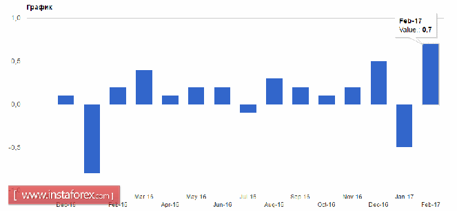 Согласно данным, в феврале 2017 года годовая инфляция в Великобритании выросла до 2,3% после 1,8% в январе. Новый показатель оказался выше целевого уровня Банка Англии, составляющего 2,0%. По сравнению с январем 2017 года инфляция выросла на 0,7%, тогда как экономисты ожидали рост лишь на 0,5%. Годовая инфляция экономистами прогнозировалась в районе 2,1%.