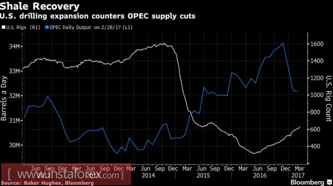 Бурильщики нефти увеличили число установок на 14 по итогам пятидневки к 17 марта, доведя их общее количество до 631, максимальной величины с сентября 2015. Добыча выросла до 9,1 млн баррелей, самого пика с февраля прошлого года, а Министерство энергетической информации США было вынуждено повысить прогнозы по производству черного золота до 9,2 млн б/с в 2017 и до 9,7 млн б/с в 2018. По мнению SEB Markets, показатель превысит отметку 10,7 млн б/с в следующем году. Таким образом, американцы по полной программе используют преференции, предоставленные им ОПЕК.