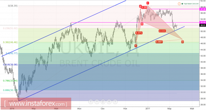 В целом, текущий набор фундаментальных факторов предполагает, что Brent, вероятнее всего, сменит торговый диапазон с $52,9-57,3 за баррель на консолидацию в торговом коридоре $50-56. Впрочем, если у «медведей» найдутся силы для обновления мартовского минимума, то риски реализации таргета на 88,6% по паттерну «Акула» ($47,5) существенно возрастут.