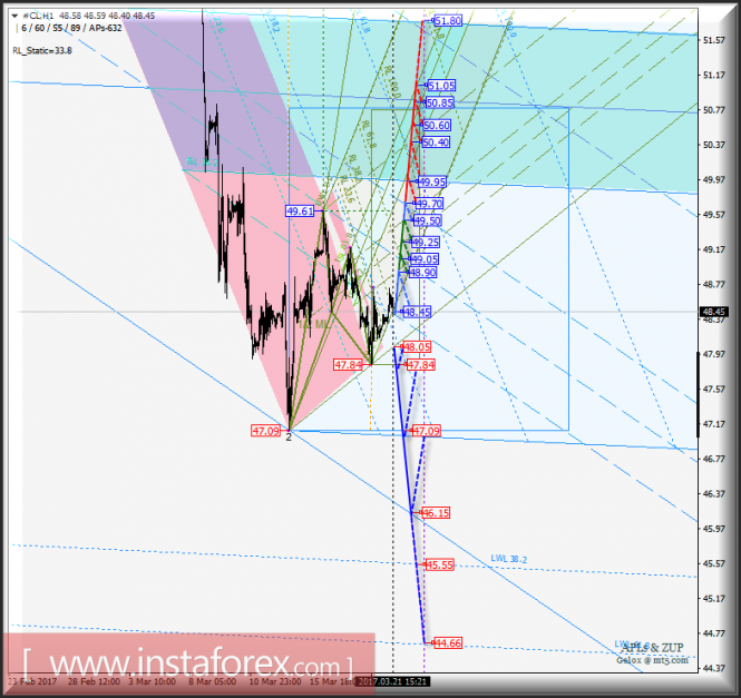 Развитие движения цены инструмента (#CL) в период 21-28 марта 2017 г. будет обусловлено отработкой нижней границы (уровень сопротивления 48.45) канала 1/2 Median Line Minuette и начальной линии SSL (уровень поддержки 48.05) вил операционного масштаба Micro.