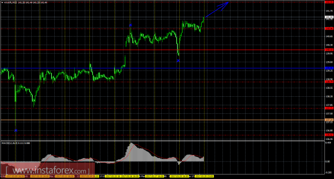 На 15-минутном графике рекомендуется рассматривать лонги с целью 142,05 при закреплении цены выше 140,96, ордером Stop Loss ниже 140,96. Разворот MACD вниз укажет на виток локальной коррекции.
