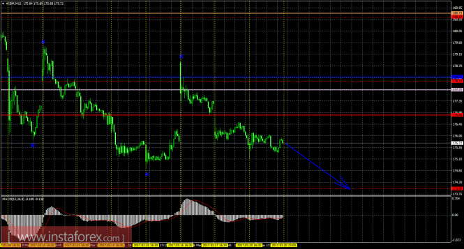 На младшем графике рекомендуется рассматривать ордера на продажу с целью 173,95 при открытии ниже Тенкан-сен (176,80), ордером Stop Loss выше 176,80 и при направленном вниз индикаторе MACD.