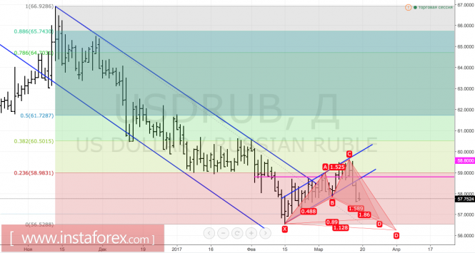 Технически неспособность «быков» по анализируемой паре закрепиться выше важного сопротивления на 58,8 свидетельствует об их слабости. Были сформированы паттерны «Обман-выброс» и «Акула». Таргеты на 88,6% и 113% по последней модели расположены вблизи отметок 56,8 и 56,3.