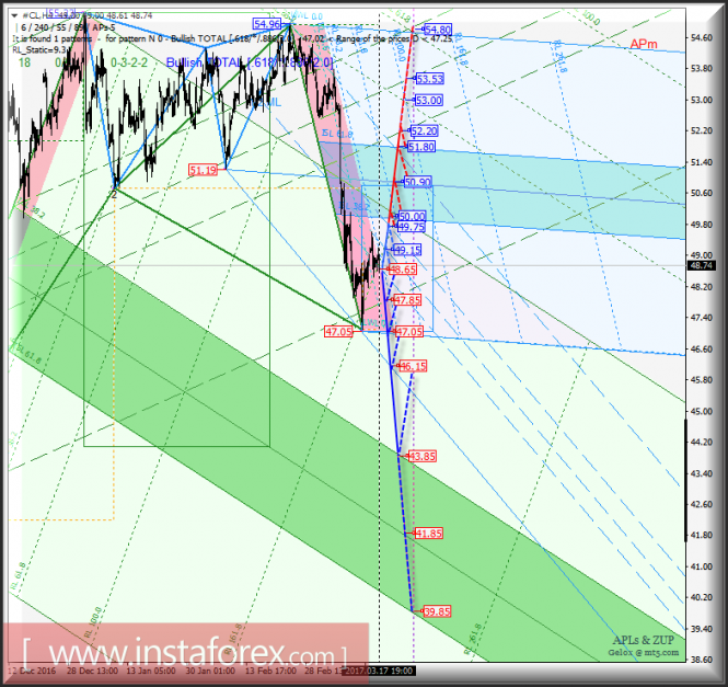 Развитие движения цены инструмента (#CL) в период 20 марта - 03 апреля 2017 г. будет обусловлено отработкой границ канала 1/2 Median Line (48.65 <-> 49.15 <-> 49.75) вил операционного масштаба Minuette.