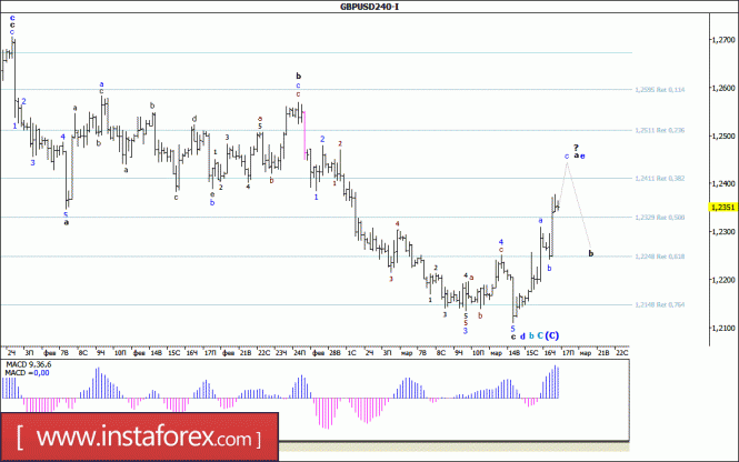 Волновая разметка предполагает построение нисходящего набора волн. В рамках предполагаемой волны с, в E, в B понижение котировок продолжается с целями, расположенными около расчетной отметки 0,9922, что соответствует 11,4% по Фибоначчи, и ниже около 0,9850. В рамках волны b, в с, в E, в B инструмент может начать повышение с целями, расположенными около отметок 1,0047 и 1,0102, что приравнивается к 38,2% и 50,0% по Фибоначчи. Неудачная попытка прорыва отметки 1,0157 привела к завершению построения волны b, в E, в B.Материал предоставлен компанией InstaForex - www.instaforex.comВолновой анализ валютной пары GBP/USD за 17 марта 2017 года