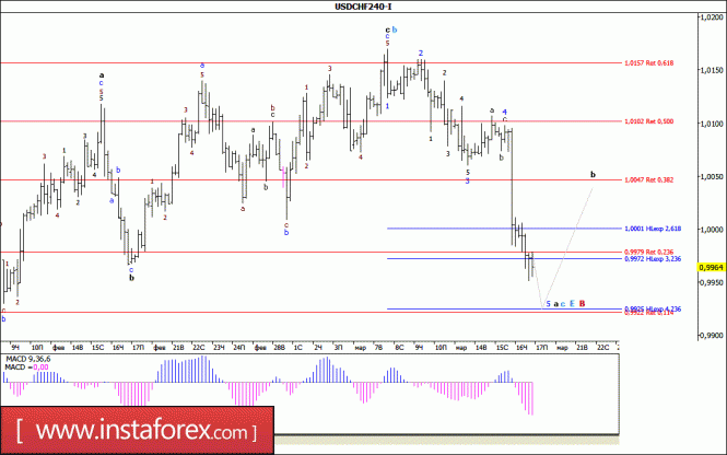 Инструмент продолжает построение волны E, в С, в (B). В рамках построения нисходящей волны, возможно с, в E, в С, в (B), понижение котировок продолжается с целями, находящимися ниже отметки 111,50. В рамках коррекционной волны b, в с, в E, в С, в (B) повышение котировок может начаться с целями, расположенными около расчетных отметок 114,26 и 115,09, что приравнивается к 38,2% и 50,0% по Фибоначчи.Материал предоставлен компанией InstaForex - www.instaforex.comВолновой анализ валютной пары USD/CHF за 17 марта 2017 года