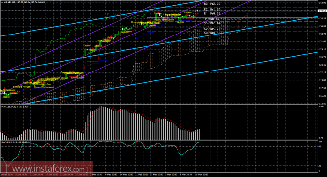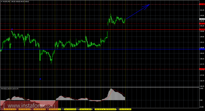 На 15-минутном графике рекомендуется рассматривать ордера на покупку с целью 141,56, при закреплении цены выше 140,33, ордером Stop Loss ниже 140,33. Разворот MACD вверх укажет на окончание коррекции, а закрепление ниже 140,33 – на ее продолжение.