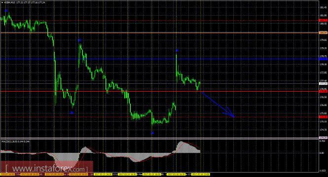 На младшем графике рекомендуется рассматривать ордера на продажу с целью 175,39, при открытии ниже Тенкан-сен (176,80), ордером Stop Loss выше 176,80 и при направленном вниз индикаторе MACD.